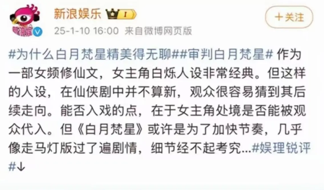古装剧市场飞速变幻,《白月梵星》播出之后,面临着《国色芳华》和《大奉打更人》两部作品的夹击,景气指数一直没能冲到榜首,还被某官方账号给了一个"下马威”,官方点评字字犀利,称这部剧虽然精美但无聊,男主像是个工具人,完全没有脱离俗套,正邪对立、妖仙对立的设计也很大众,很多人都被这样千篇一律的剧情劝退了。