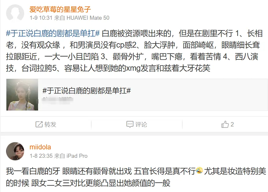 除了演技问题以外,白鹿的颜值问题最受诟病,她身为95后,本来很年轻,脸上却有了一些沧桑之相,颧骨很突出,比剧中饰演她姐姐的代露娃更显老。